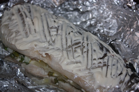 Туда же лимон, порезанный на небольшие дольки. Заворачиваем в фольгу.