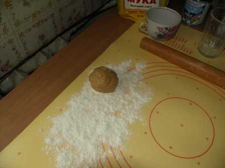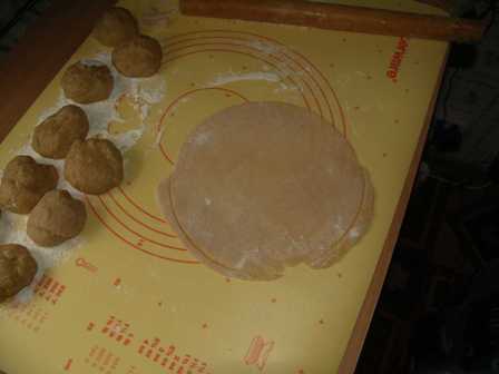 Шарики раскатываем на столе в блины толщиной 1-2мм и обрезаем по диаметру сковороды.