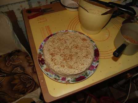 Выставляем торт в прохладное (можно в комнату) место на несколько часов для того, чтоб коржи пропитались кремом и затем в холодное место типа балкона или холодильника и всё, тортик готов)))