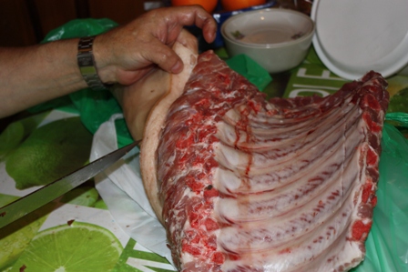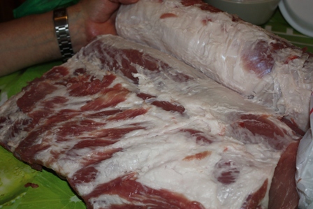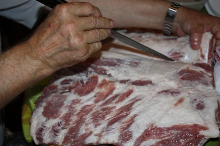 А вот теперь переходим к мясу. Нужно отделить сало со шкурой (это мы потом засолим). Я бы посоветовала это дело поручить мужчине!