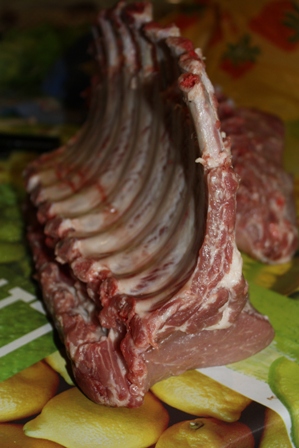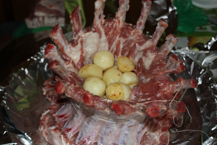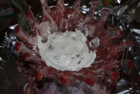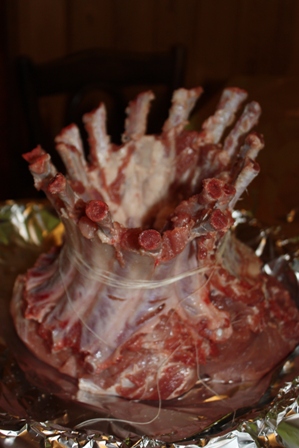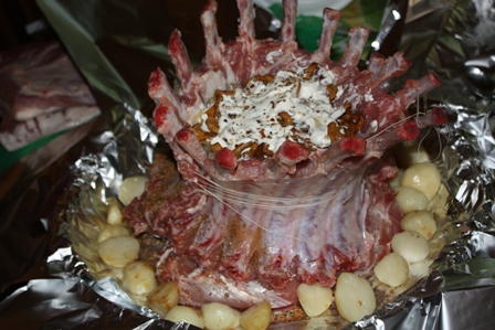 Складываем ребрышки в корону, как бы внутрь. Нужно подрезать ребрышки по костям, чтобы удобно скручивалось. Завязываем крепко нитками и выкладываем в форму на фольгу.