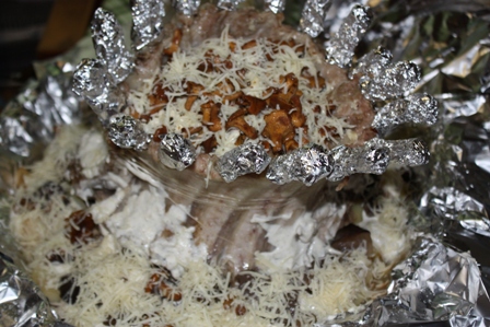 Раскрываем фольгу, смазываем опять сметаной и посыпаем тертым сыром. Теперь нужно обязательно каждую косточку обернуть фольгой, чтобы они не подгорели.