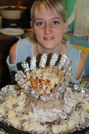 Затем лисички и опять сметана со специями. Оставшийся картофель мы выложили по краям короны.