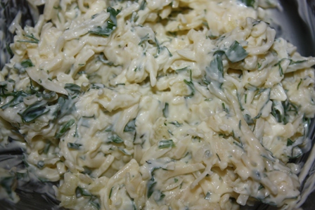 Сначала делаем начинку: смешиваем сыр, рубленную зелень, немного майонеза и добавляем немного чеснока. Перемешиваем.