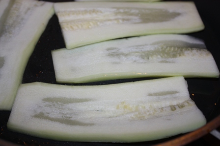 Кабачки нарезаем на тонкие полоски и обжариваем с двух сторон.