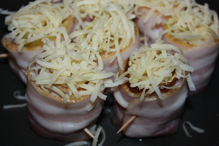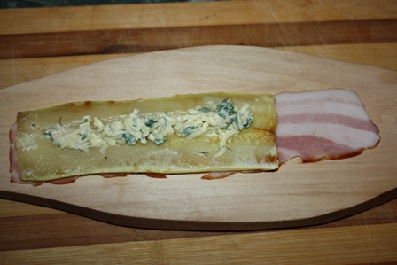 Берез полоску бекона, сверху кладем кабачок и в серединку выкладываем немного начинки.