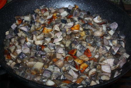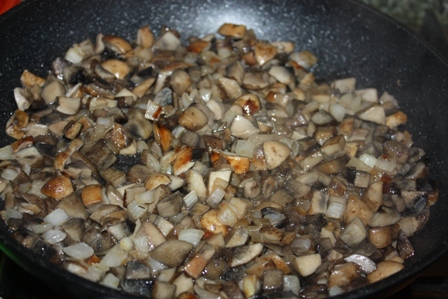 В сковороду наливаем немного воды и выкладываем грибы. Скоро они дадут сок и тушим их примерно 30 минут.