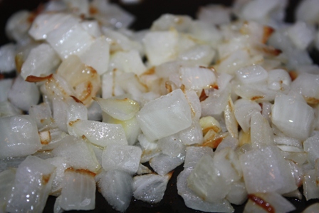 Лук также мелко нарезаем и обжариваем на отдельной сковороде.
